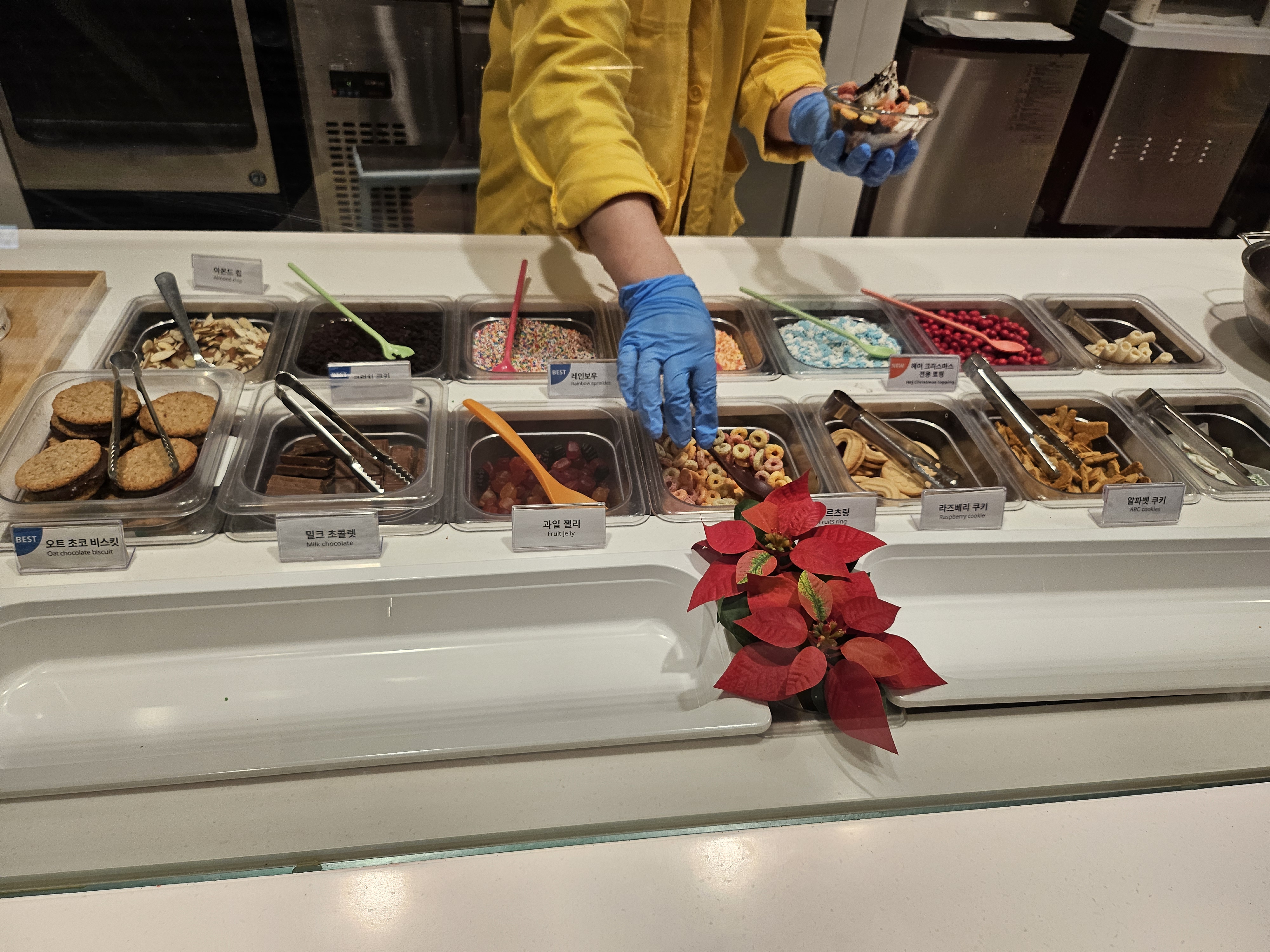 3,000원에 아이스크림 종류를 고르고, 무료토핑 2개를 고를 수 있습니다.