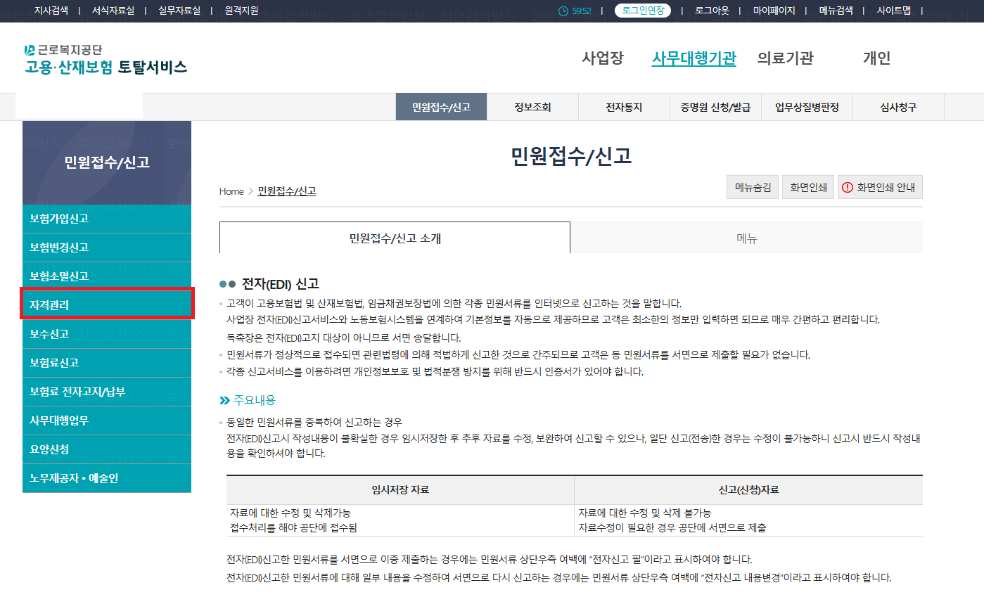 2. 민원접수/신고 -> 자격관리탭 클릭