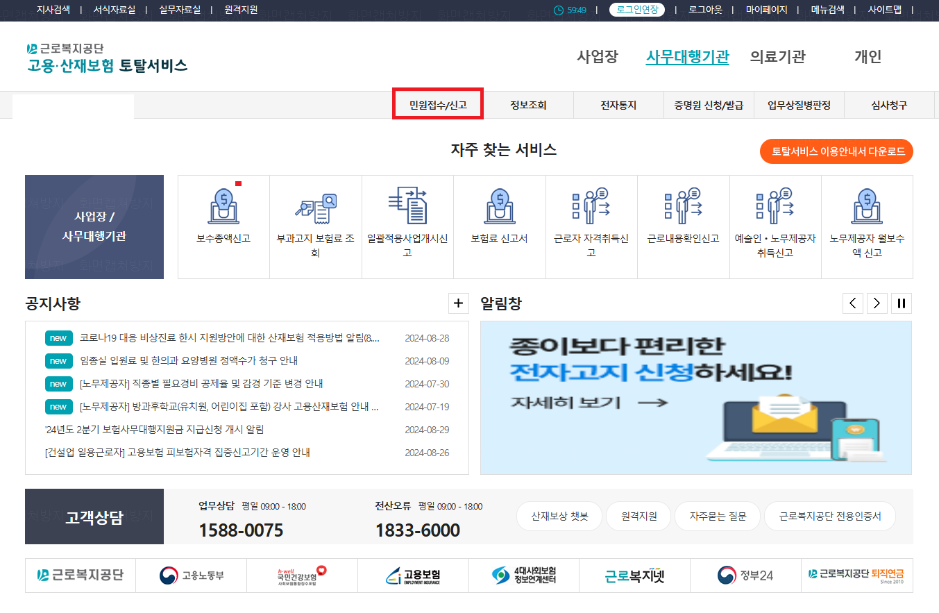 1. 고용산재보험 토탈서비스 로그인 후 민원접수/신고탭으로 들어갑니다.