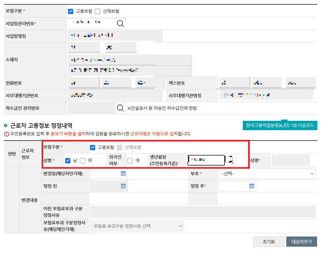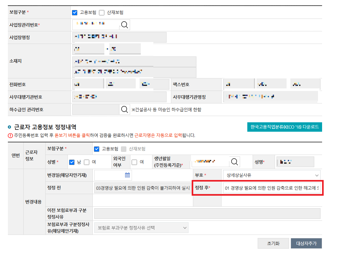 6. 사업자정보가 맞다면, 하단 근로자고용정보 정정내역에 상실사유 변경신고 대상 근로자 정보를 입력합니다.