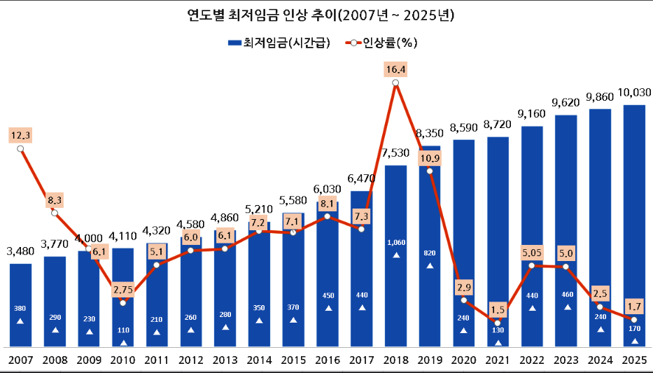사업의 종류별 구분 없이 전 사업장에 동일하게 2025년 최저시급은 10,030원으로,