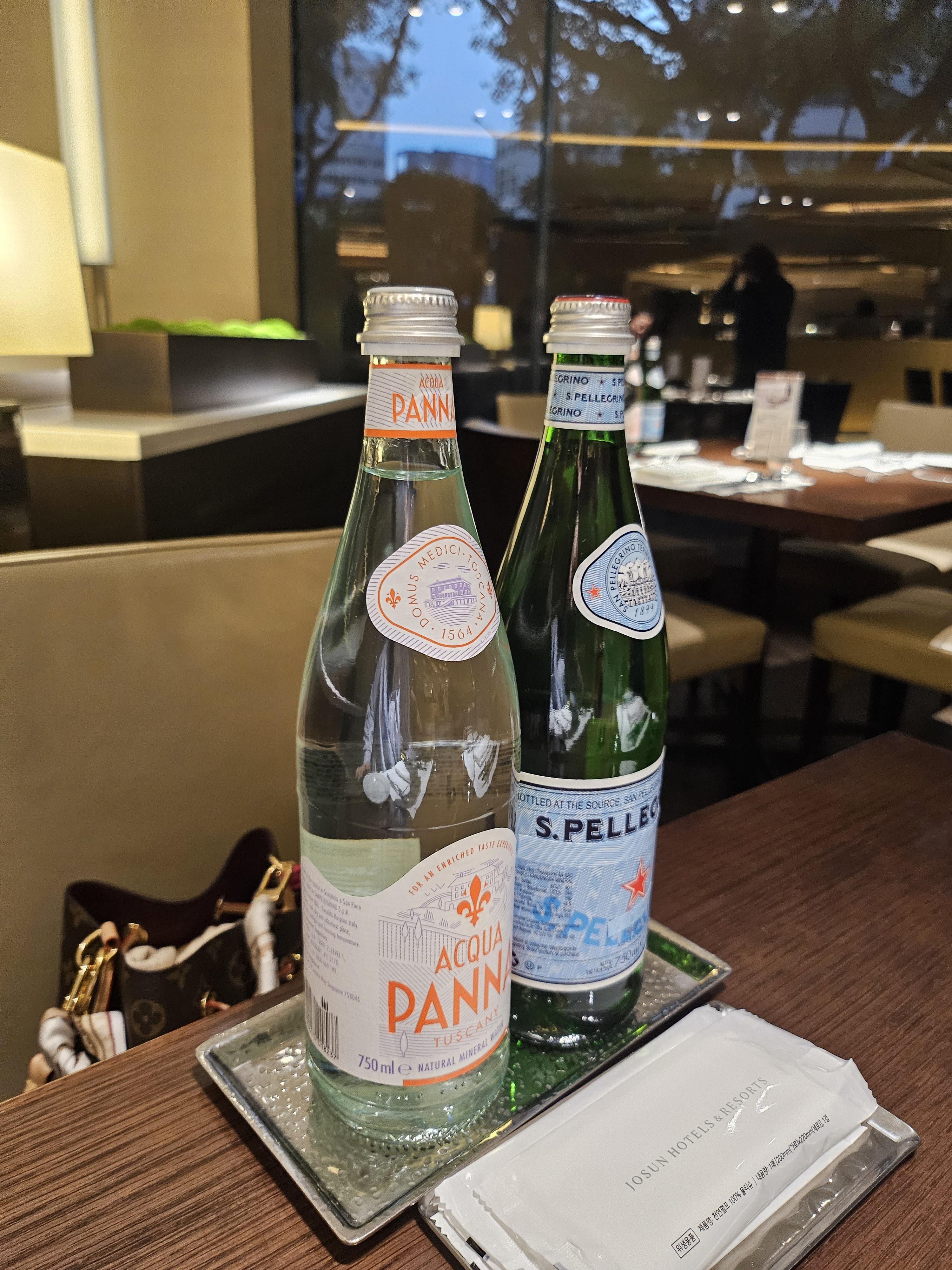 처음 들어가면 자리마다 탄산수와 생수, 물티슈가 구비되어 있으며
