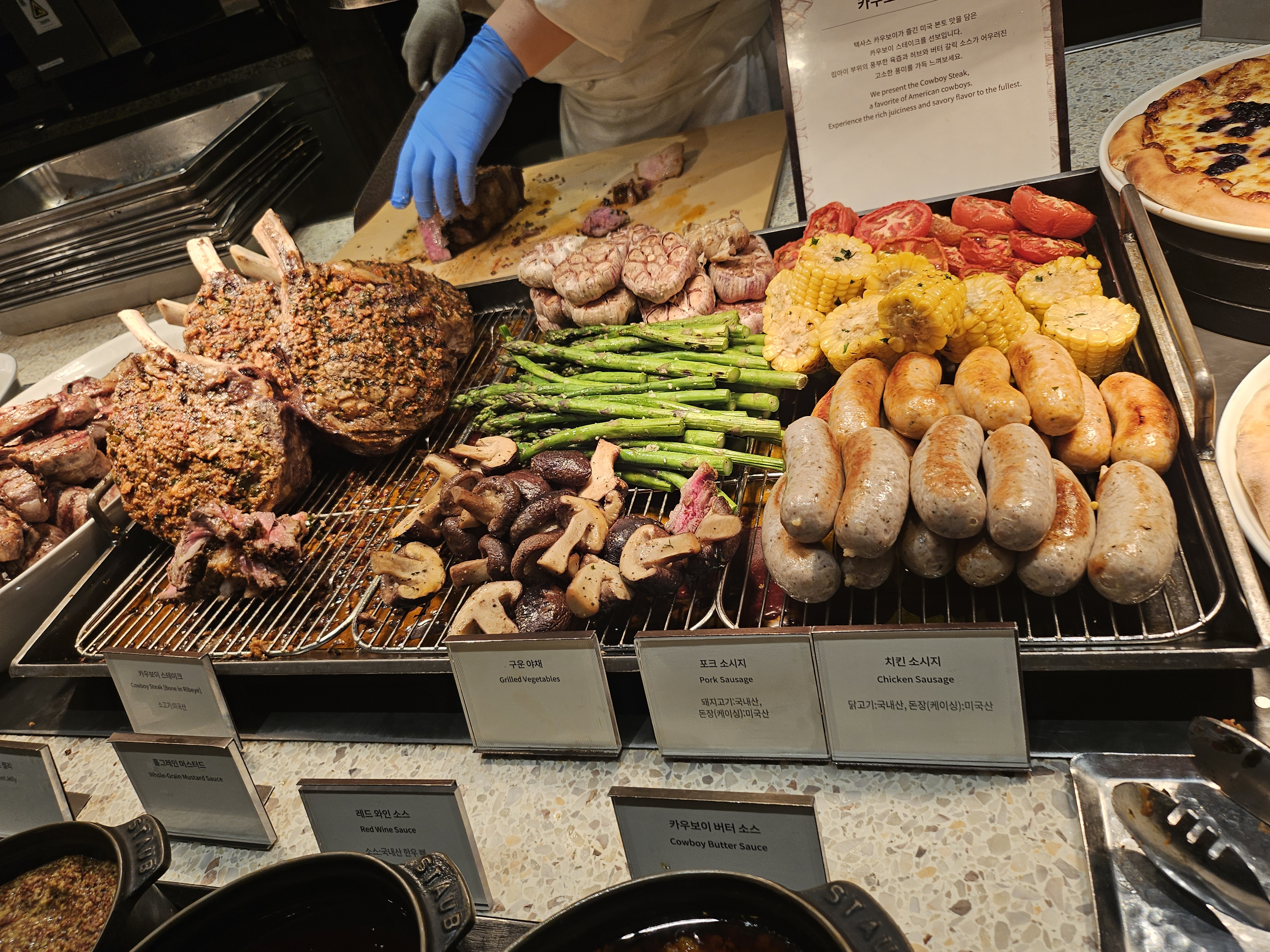 지중해식 대하구이, 전복, LA갈비, 양갈비, 카우보이스테이크, 구운 야채등이 있으며
