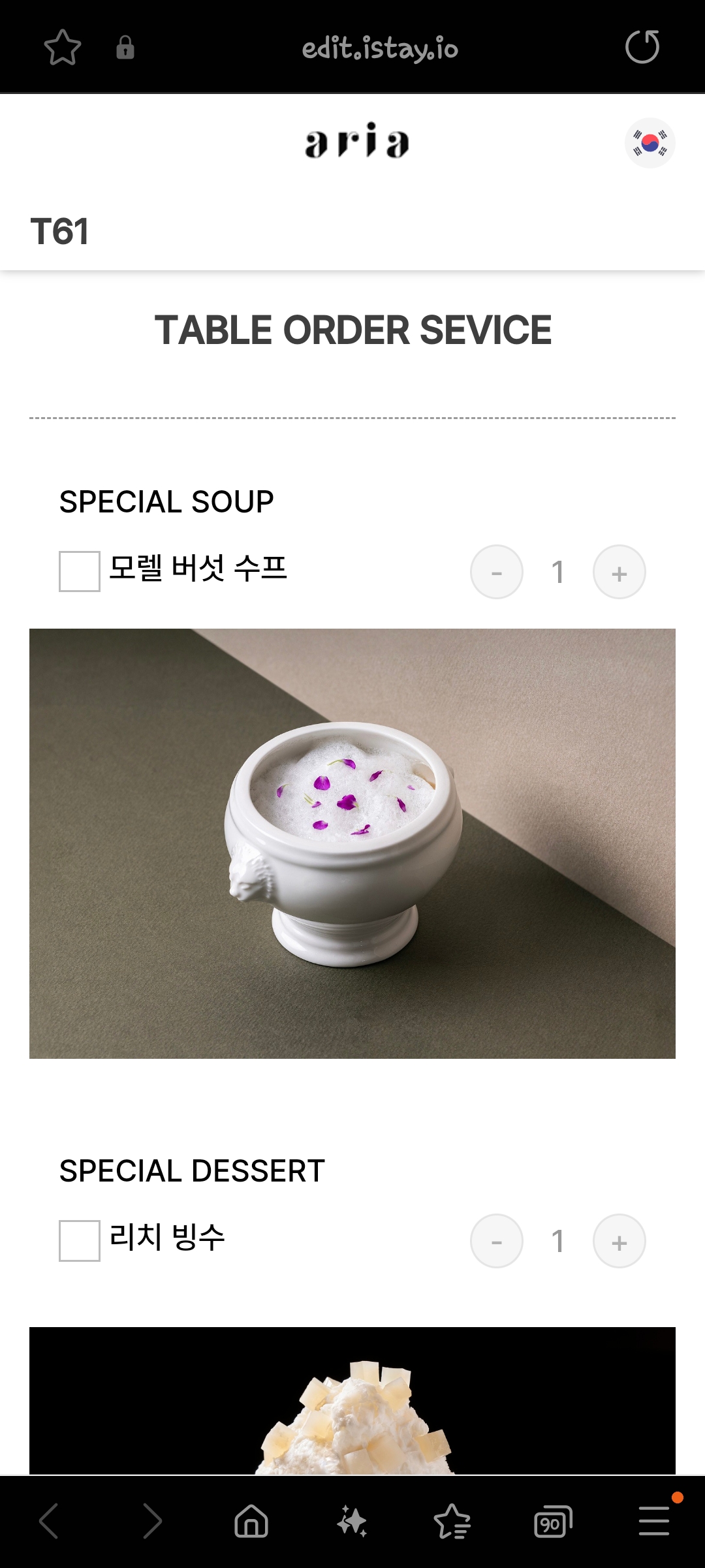 큐알코드를 스캔하면 아래와 같이 모렐버섯스프와 리치빙수를 주문 할 수 있습니다.