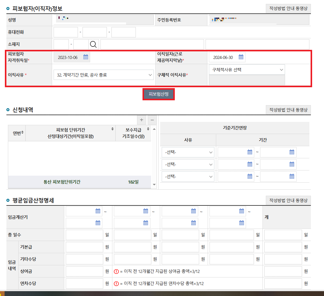 6. 이직일자(근로제공의마지막날) 입력 및 이직사유, 구체적(상세)이직사유 작성 후 피보험 산정 클릭