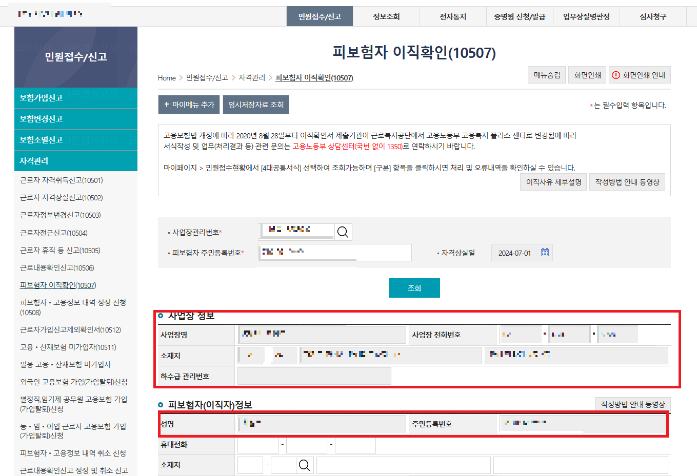 5. 자동기입되는 사업장 정보 및 피보험자(이직자)정보 확인
