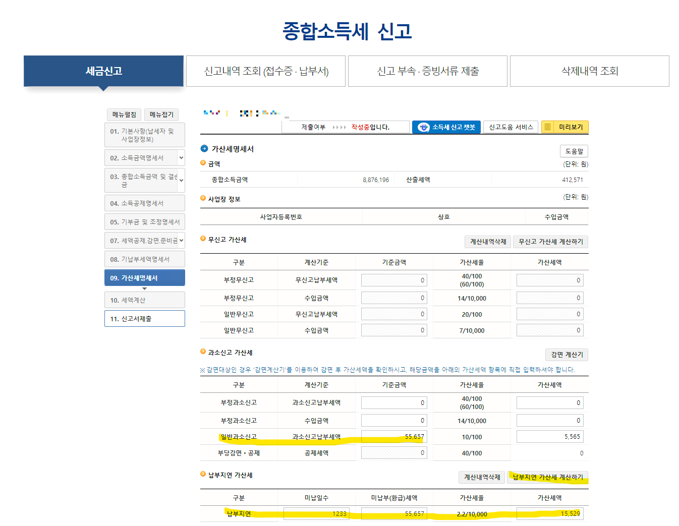 7. 09. 가산세명세서를 작성합니다.