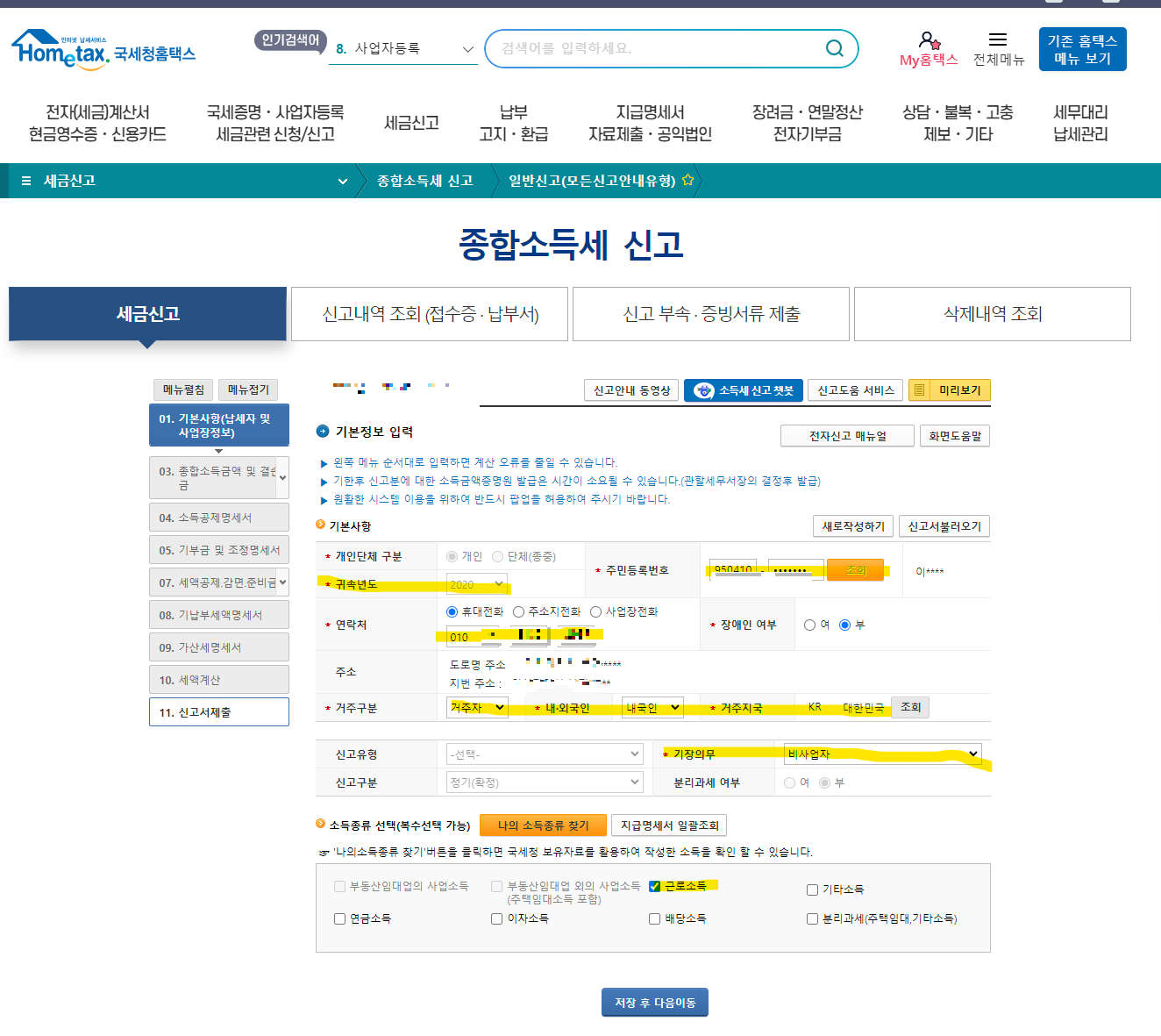 기장의무는 비사업자/소득유형을 체크 하고 저장후 다음이동을 눌러줍니다.