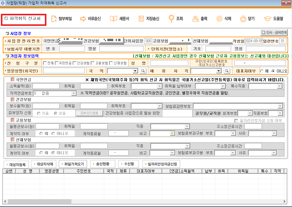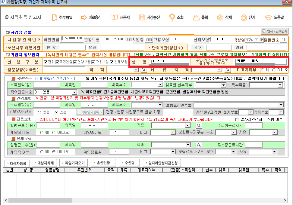 3. 취득 가입대상 근로자의 성명과 주민번호를 입력합니다.