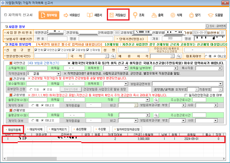 5. 모든 작성이 끝났다면, 대상자 등록 및 저장송신를 눌러 신고를 마무리합니다.