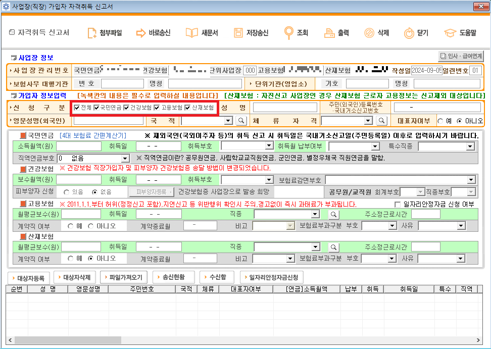2. 4대보험 모두 가입대상자라면 신청 구분에 전체를 체크합니다.